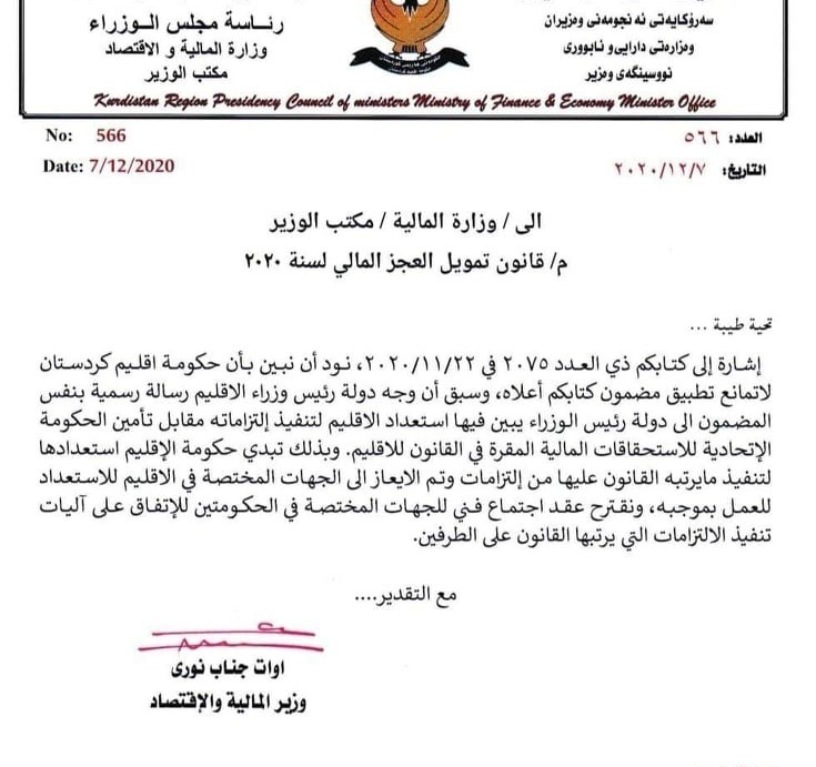 أربيل/ شبكة أخبار العراق- وافقت حكومة اقليم كردستان، على العمل بموجب مضمون قانون الاقتراض الذي أقره البرلمان العراقي، في ظل الاحتجاجات التي تشهدها عدد من مناطق الاقليم.وأظهرت وثيقة بتوقيع وزير المالية والاقتصاد في حكومة إقليم كردستان، أوات جناب نوري، موافقة حكومة الإقليم على استعدادها لتنفيذ ما يرتبه القانون عليها من التزامات وتم الايعاز للجهات المختصة، في الإقليم للاستعداد للعمل بموجبه، واقترح نوري، عقد اجتماع فني للجهات المختصة في الحكومتين للاتفاق على اليات تنفيذ الالتزامات التي يرتبها القانون على الطرفين.إلى ذلك، قال وزير حكومة إقليم كردستان لشؤون المركز، خالد شواني، إن، حكومة إقلیم كردستان أبدت موافقتها علی التعامل مع مضمون قانون العجز المالي لسنة 2020، علی الرغم من تحفظنا علی طریقة تمریر القانون في مجلس النواب، وقد أبلغت حكومة الإقلیم بشكل رسمي الحكومة الاتحادیة باستعدادها لتنفیذ الالتزامات التي یرتبها القانون علی الإقلیم، واقترحنا عقد اجتماع بین الجهات المختصة في الحكومتین لبدء إجراءات تنفیذ القانون، وبذلك ننتظر من الحكومة الاتحادیة تأمین الاستحقاقات المالیة المقرة للاقلیم في القانون.