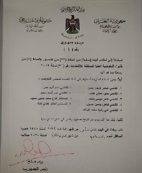 بغداد/شبكة أخبار العراق- أصدرت رئاسة الجمهورية، الخميس، مرسوما جمهوريا لتعيين 7 قضاة ومستشارين اثنين، اعضاء لمجلس المفوضين.ونص المرسوم الذي حصلت عليه (شبكة أخبار العراق)، على انه “استنادا الى احكام البند (سابعا) من المادة (73) من الدستور والمادة (5) من قانون المفوضية العليا المستقلة للانتخابات رقم (31) لسنة 2019، تقرر تعيين السادة المدرجة اسماؤهم ادناه اعضاء لمجلس المفوضين”.ويضيف، أن “الاسماء هي: القضاة، عباس فرحان حسن، جليل عدنان خلف، عامر موسى محمد، فياض ياسين حسين، علي رشيد محمد، دهام أكرم عمر، عمر احمد محمد، والمستشارين فتاح محمد حسين وأحلام عدنان لفتة”.