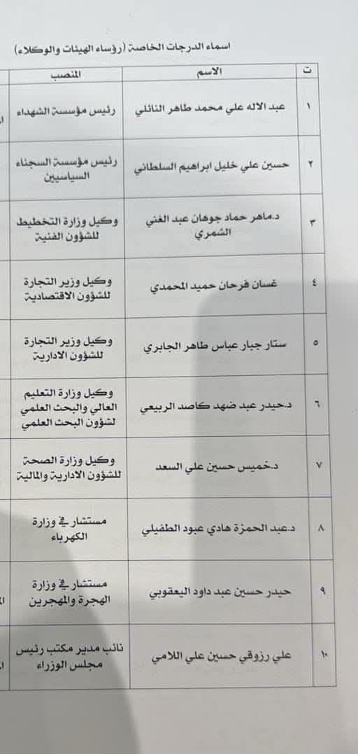 بغداد/ شبكة أخبار العراق- تنشر “وكالة شبكة أخبار العراق”، قائمة بأسماء عدد من الدرجات الخاصة التي صوت عليها مجلس النواب، في جلسته الأحد، (2 شباط 2025)، بطلب من مجلس الوزراء.