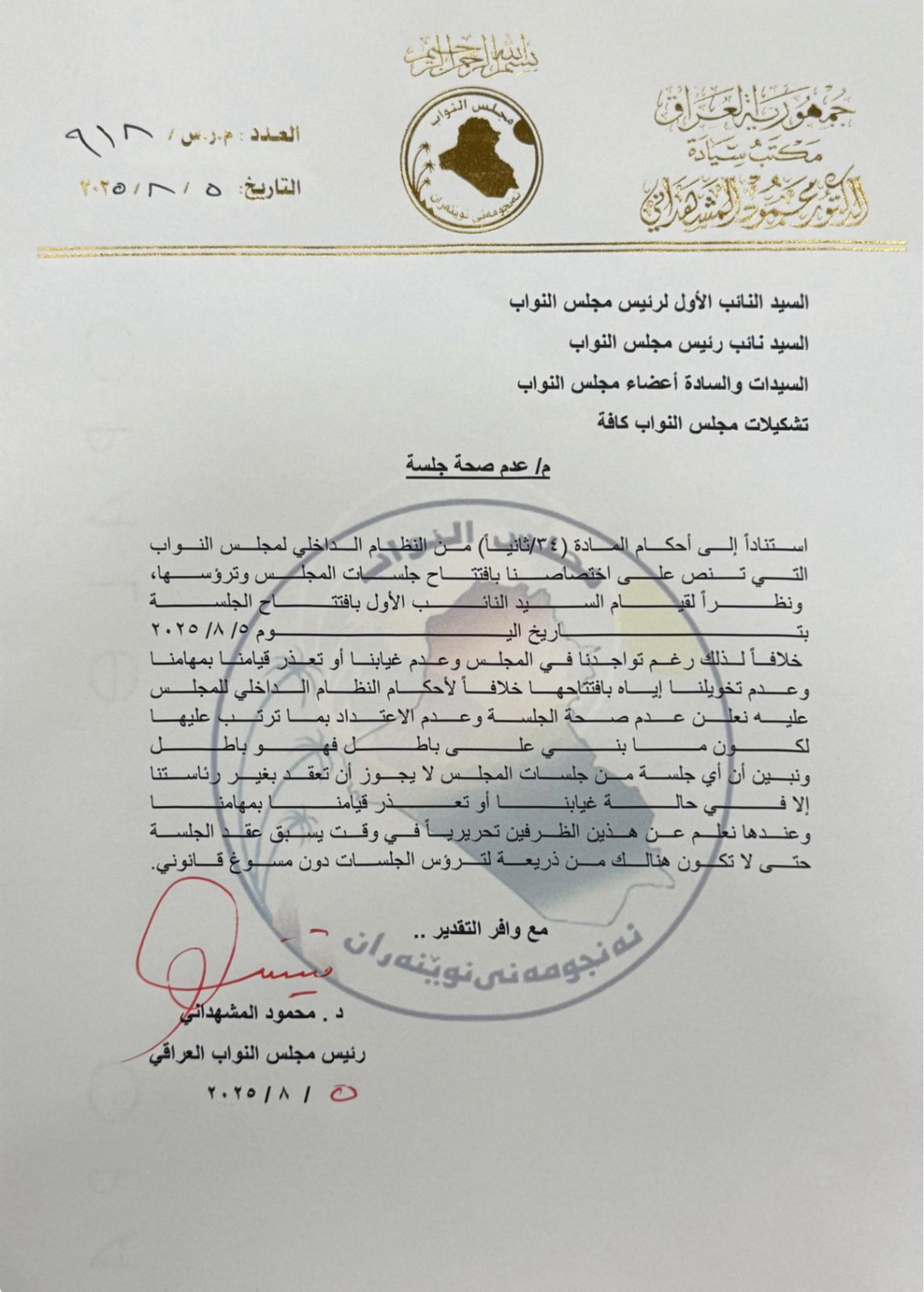 بغداد/ شبكة أخبار العراق- أعلن رئيس مجلس النواب العراقي محمود المشهداني، أن جلسة البرلمان المنعقدة اليوم الثلاثاء 5 آب 2025 “غير صحيحة”، لكونها عقدت دون رئاسته.جاء ذلك في كتاب رسمي موقّع من قبله وموجّه إلى النائب الأول لرئيس مجلس النواب ونائب الرئيس وأعضاء المجلس وتشكيلاته كافة.واستند المشهداني في قراره إلى أحكام المادة (34/ثانياً) من النظام الداخلي لمجلس النواب، التي تنص على اختصاصه بافتتاح الجلسات وترؤسها، مشيراً إلى أن النائب الأول قام بافتتاح جلسة اليوم خلافاً لتلك الأحكام، رغم تواجده داخل المجلس وعدم تغيّبه أو تعذر قيامه بمهامه، ودون أن يمنحه تخويلاً بذلك.وأوضح المشهداني أن ما جرى يُعد مخالفة صريحة للنظام الداخلي، معلناً “عدم صحة الجلسة وعدم الاعتداد بما ترتب عليها”، مضيفاً: “لأن ما بني على باطل فهو باطل”.وشدد رئيس البرلمان على أنه لا يجوز عقد أي جلسة من جلسات المجلس دون رئاسته، إلا في حال غيابه أو تعذّر قيامه بمهامه، على أن يُبلغ المجلس تحريرياً بذلك وفي وقت يسبق عقد الجلسة، حتى لا يكون هناك ذريعة لترؤس الجلسات دون مسوغ قانوني.وشهد مجلس النواب العراقي، امس الثلاثاء، “جلسة ساخنة” تخللتها اعتراضات وخلافات على بعض القوانين بلغت حد التجاوزات اللفظية والمشادات الكلامية بين رئيس المجلس ونائبه الأول محسن المندلاوي، لينتقل الخلاف من منصة الرئاسة إلى مقاعد النواب.