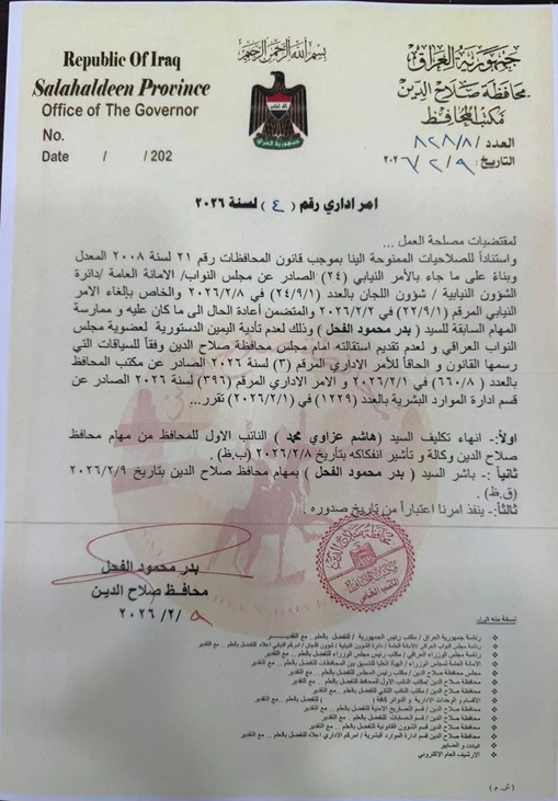 بغداد/ شبكة أخبار العراق- عاد بدر محمود الفحل، لمنصب محافظ صلاح الدين، بعد إنهاء تكليف النائب الأول للمحافظ هاشم عزّاوي محمد من مهامه، وإنهاء وكالته.وبحسب أمر إداري، فقد تقرر تكليف بدر محمود الفحل بمهام المحافظ اعتباراً من تاريخ اليوم الاثنين التاسع من شباط الجاري، بعد استكمال الإجراءات القانونية والإدارية ذات الصلة.وأشار الأمر إلى أن القرار جاء نتيجة عدم تلبية المتطلبات القانونية المتعلقة بعضويته في مجلس النواب ، وعدم تقديم الاستقالة الأصولية أمام مجلس محافظة صلاح الدين، وفق السياقات المعتمدة.