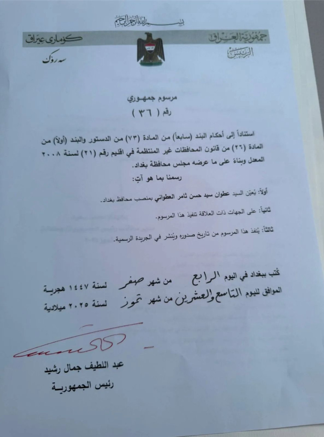 بغداد/ شبكة اخبار العراق- اصدر رئيس الجمهورية عبد اللطيف رشيد مرسوماً بتعيين القيادي قي حزب الدعوة عطوان العطواني محافظاً لبغداد للمرة الثانية، الاولى في عهد المالكي والثتنية في عهد قرينه السوداني.