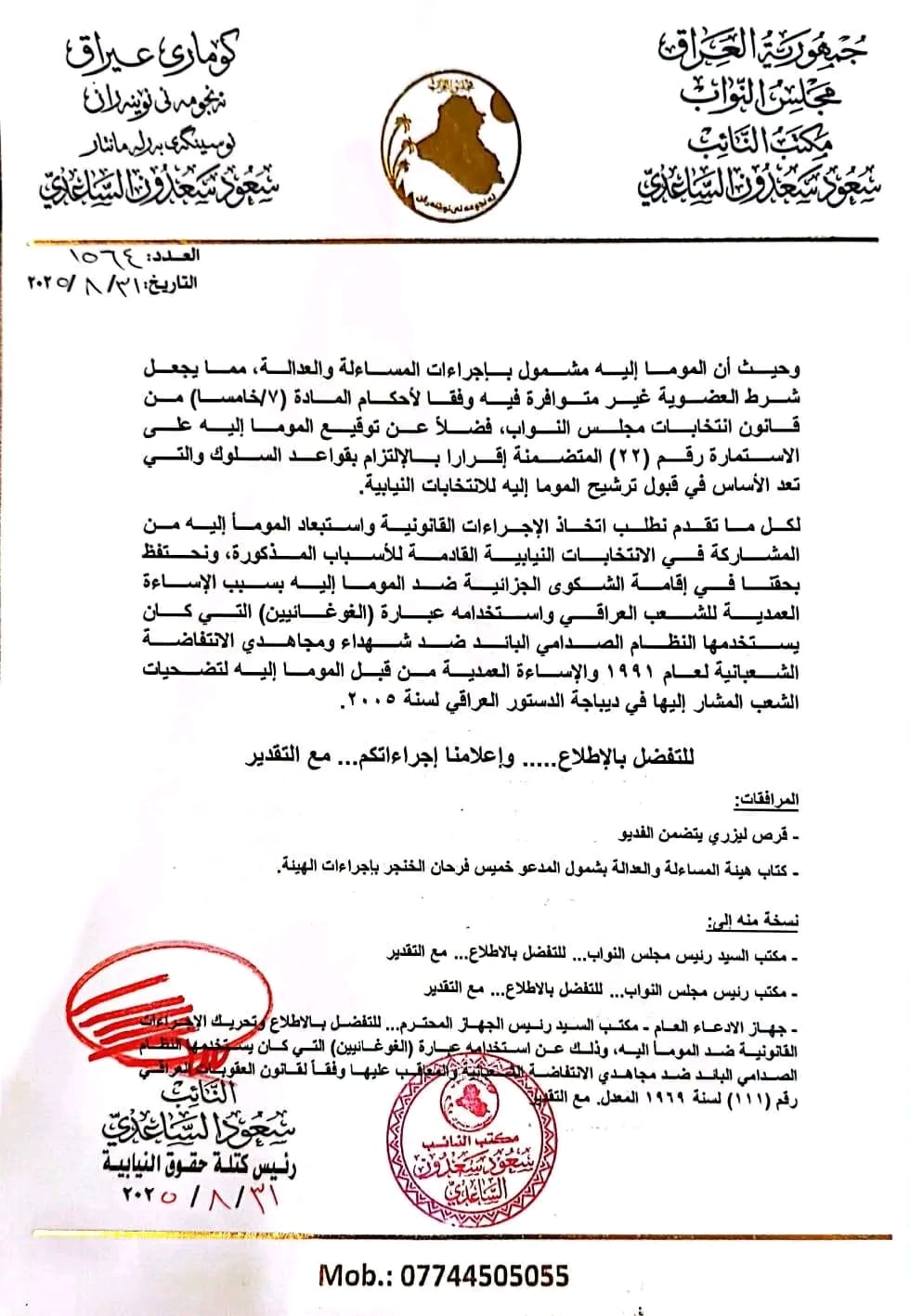 بغداد/ شبكة أخبار العراق- قال المكتب الإعلامي للنائب عن ميليشيا كتائب حزب الله سعود الساعدي، في بيان ،الاثنين، إن “النائب قدم شكوى ضد خميس فرحان الخنجر، وذلك لإساءته المتعمدة للشيعة الولائية من خلال استخدامه عبارة (الغوغائيين) التي كان يستخدمها النظام السابق ضد الانتفاضة الشعبانية”.وأضاف أن “تبني هكذا خطاب يمس مشاعر الشيعة الولائية ولا يمكن أن يكون ضمن التعددية السياسية في العراق”، مطالبا رئيس مجلس المفوضين في المفوضية العليا المستقلة للانتخابات بـ”اتخاذ الإجراءات القانونية واستبعاد المرشح للانتخابات رئيس حزب السيادة خميس فرحان الخنجر من المشاركة في الانتخابات النيابية”.وجاء في الكتاب الرسمي أن “الخنجر استخدم المؤسسات الدينية (جامع أبوبكر الصديق في منطقة الغزالية) لأغراض انتخابية تتضمن الترويج له ولحزبه في انتخابات مجلس النواب، الأمر الذي يشكل جريمة يعاقب عليها قانون انتخابات مجلس النواب ومجالس المحافظات”.وخلال اليومين الماضيين، أثار رئيس حزب السيادة خميس الخنجر، جدلا كبيرا، عبر ظهوره بمقطع فيديو في خطبة له داخل جامع، وكان يتحدث عن انقاذ أبناء المكون السني، وعدم تركهم لـ”الغوغائيين”.