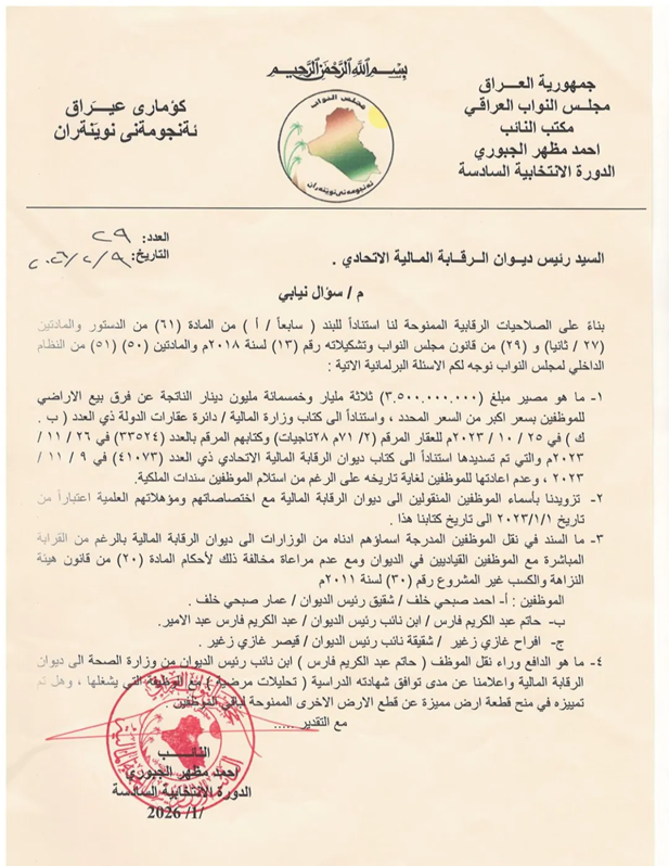 بغداد/ شبكة أخبار العراق- كشف النائب أحمد مظهر الجبوري عن “مجهولية مصير” مبلغ 3.5 مليار دينار تعود لموظفين في ديوان الرقابة المالية لم تتم إعادتها إليهم، مبيناً أن هذا المبلغ هو “فرق سعر بيع الأراضي”.وجاء في سؤال نيابي رسمي موجه من الجبوري إلى ديوان الرقابة المالية، يتساءل فيه النائب عن “مصير مبلغ 3 مليارات و500 مليون دينار عراقي، ناتج عن فرق بيع أراضٍ للموظفين بسعر أعلى من السعر المحدد”، ولم تتم إعادة “هذا المبلغ إلى الموظفين حتى الآن، رغم تسلّمهم سندات الملكية”.وفي محور آخر، طالب الجبوري بتزويد مجلس النواب “بقائمة أسماء الموظفين المنقولين إلى الديوان منذ 1/1/2023 مع اختصاصاتهم ومؤهلاتهم العلمية”.ووفقاً لبيان توضيحي من مكتب النائب الجبوري، يأتي السؤال حول “ما إذا كانت التعيينات والنقل تتم وفق معايير مهنية واضحة أم وفق اعتبارات أخرى”.كما تساءل الجبوري عن: “السند القانوني لنقل موظفين من وزارات إلى الديوان رغم القرابة المباشرة مع موظفين قياديين داخل الديوان”.وبحسب البيان فإن من بين الموظفين المنقولين للديوان “موظف هو شقيق رئيس الديوان، وموظف ابن نائب رئيس الديوان، وموظفة شقيقة نائب رئيس الديوان”.وفي المحور الأخير من السؤال النيابي، أشار الجبوري إلى “نقل موظف من وزارة الصحة إلى ديوان الرقابة المالية”، متسائلاً: “هل تتوافق شهادته الدراسية (تحليلات مرضية) مع طبيعة عمله داخل الديوان؟، وهل جرى تمييزه بمنح قطعة أرض مميزة عن بقية الأراضي الممنوحة لموظفين آخرين؟”.وختم بالقول: “الأسئلة لا تتعلق بوزارة خدمية فقط، بل تتعلق بجهة رقابية سيادية، وأي خلل في المال والإجراءات داخلها يعني أن جرس الإنذار لا يرن خارج المؤسسة فقط، بل داخل بيت الرقابة نفسه”.