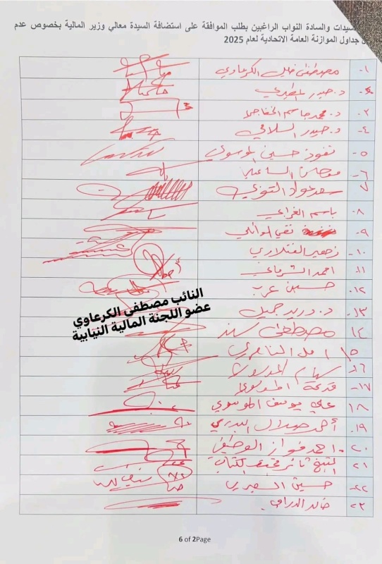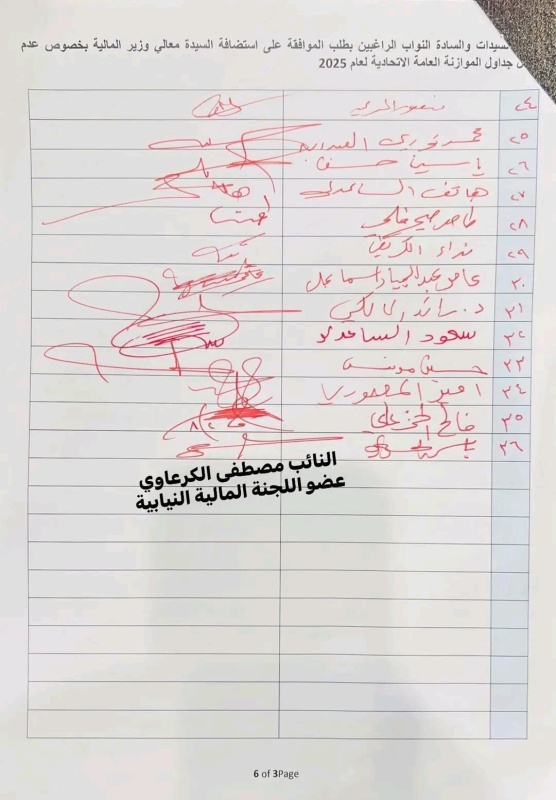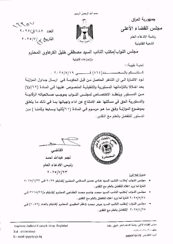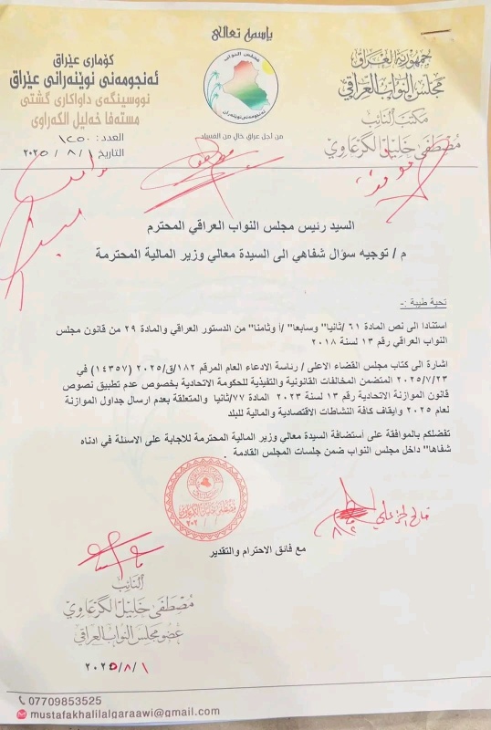 الرئيسيةاقتصادية نواب يتساءلون عن أسباب تعطيل موازنة 2025 آخر تحديث: 3 غشت 2025 - 11:47 صبغداد/ شبكة أخبار العراق- أعلن النائب مصطفى الكرعاوي،الاحد، عن جمع تواقيع رسمية وتقديم طلب سؤال شفهي موجَّه إلى وزيرة المالية طيف سامي لمساءلتها بشأن تعطيل جداول الموازنة وتأخير الصرف.ادناه نص الوثائق كما وردت لـ”بغداد اليوم”:-