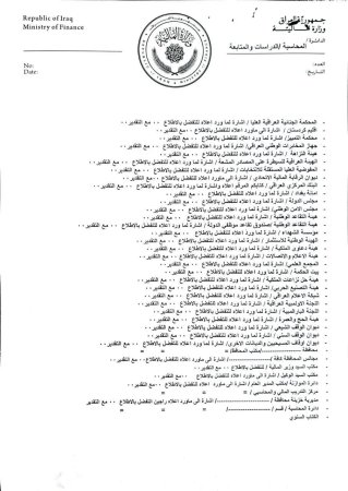 بغداد/ شبكة أخبار العراق- جددت وزيرة المالية طيف سامي، امس الإثنين، دعوتها الجهات كافة بتزويدها بالقوائم والجداول الخاصة بالرواتب لمنتسبيها على الملاك الدائم والعقود والأجراء اليوميين أن يكونوا المصروف فعلياً للسنة السابقة مع قرص (CD) مدمج بعد أن يتم تدقيقه وتوقيعه من قبل مدير الحسابات ومدير القسم المالي ومدير قسم التدقيق ورئيس الدائرة أو الوزير أو رئيس الجهة غير المرتبطة بوزارة أو المحافظ أو من يخوله قانوناً.